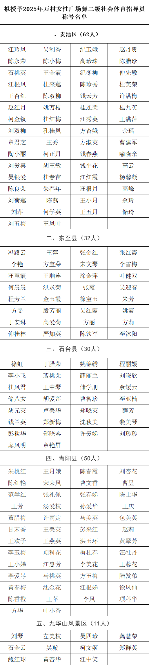根据国家体育总局公布的《社会体育指导员管理办法》和《社会体育指导员技术等级标准》的有关规定,现对拟授予万村女性广场舞二级社会体育指导员称号的185人进行公示,公示期为2025年10月31日-11月6日。公示期内,如有异议,任何单位和个人均可以电话、书面或其他形式向池州市教育和体育局反映。以单位名义反映问题的,要加盖单位公章;以个人名义反映问题的,需署名或当面反映。