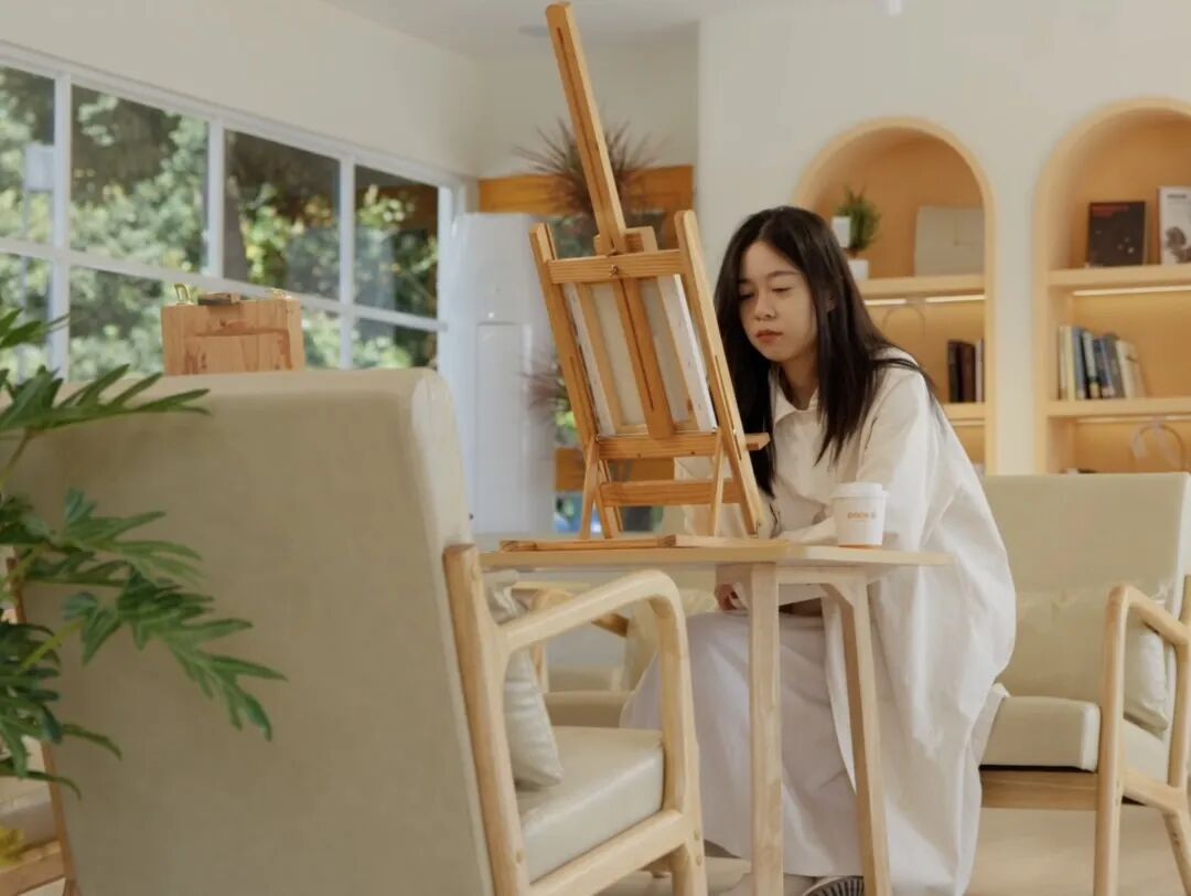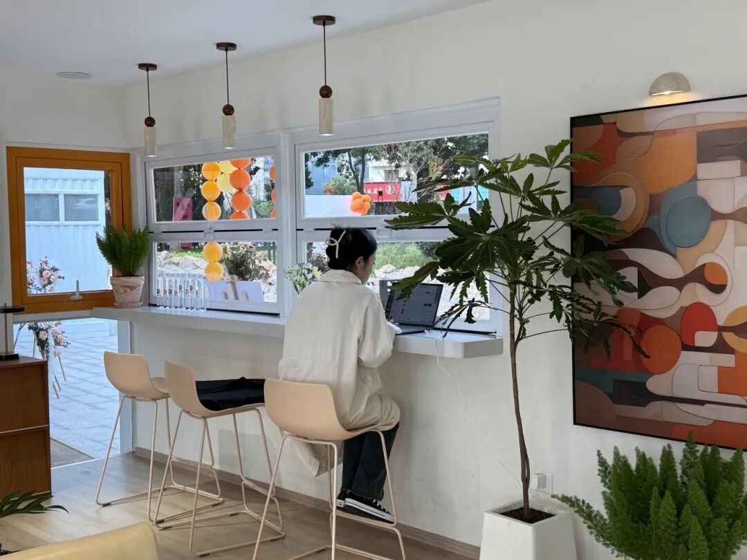 记者一走进咖啡馆内,就看见一整面玻璃的落地窗,在窗边就能坐拥无限秋景。除了咖啡,这里还巧妙融合了书吧、沉浸式工作区,以及二楼的休闲露台。“我们希望打造一个可以让人放松的城市公园新角落。让不同领域的人在这里相遇、交流,碰撞出新的创意火花。”主理人吴玮豪介绍说。