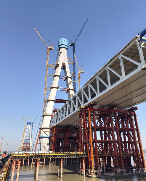 晴日下的长江岸线,江风裹着机械的轰鸣掠过江面,抬眼望去,主塔塔身上的红色桁架与数台塔吊交织成密集的作业网。“目前我们正全力推进南主塔第39节混凝土浇筑施工,浇筑完成后主塔高度将达到227米,相当于75层楼的高度。”中铁大桥局池州长江公铁大桥二标项目部现场技术负责人魏岩介绍,当前共有100余名建设者坚守岗位,正以“每周一节”的节奏,推动南主塔向上拔节,预计2026年春节前实现主塔封顶,这将为项目整体竣工奠定核心基础。